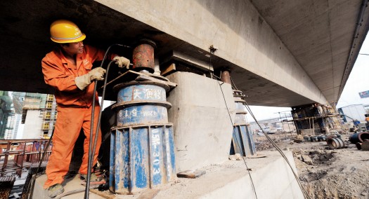 5月 29日下午,记者在施工现场看到,原先桥梁的墩柱四周已经被四根粗壮的千斤顶包围,而在千斤顶的下方,新制好的梁则将原有的墩柱紧紧包裹住,施工人员告诉记者,“这就叫抱柱梁”,等到正式顶升时,先用专门的切割机对抱柱梁进行切割,然后在PLC同步液压系统的控制下,千斤顶慢慢将桥梁顶起,再将桥下的墩柱进行接长,便完成了顶升的一个步骤。“好比是将一条桌腿进行加高,先将桌面抬高, 再把桌腿垫高。”施工人员用一个简单通俗的比喻来解释“顶升”的过程。