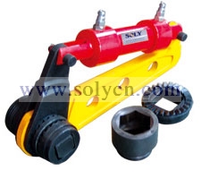 手动高压泵由操纵手柄,高压泵、换向阀、油箱、压力表和带快速接头的输油管等组成。带棘轮式液压扳手由高压油口、液压油缸、曲柄、反力杆、棘轮装置、套筒等组成、前者系动力源部件,后者为扭矩执行机构。