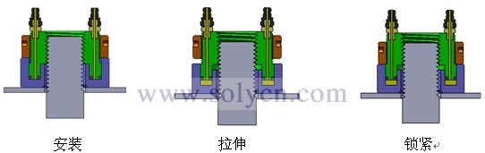 液压螺母是一种先进的螺栓装配方法,特别适用于狭窄空间和重负荷振动机械紧固,液压螺母的工作原理是利用液压油缸直接对螺栓施加外力,使被施加力的螺栓在其弹性变形区内被拉长,螺栓拉长后旋紧液压螺母上的锁圈,这样螺栓就会被锁圈锁止在拉长的位置上。